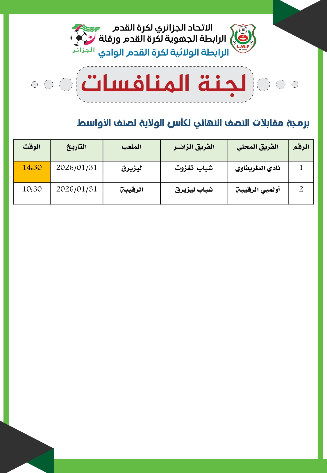 تعلم لجنة المنافسة للرابطة الولائية لكرة القدم عن برمجة الدور النصف نهائي كأس الولاية لفئة الأواسط وذلك يوم الجمعة والسبت 30 و 31 جانفي 2026