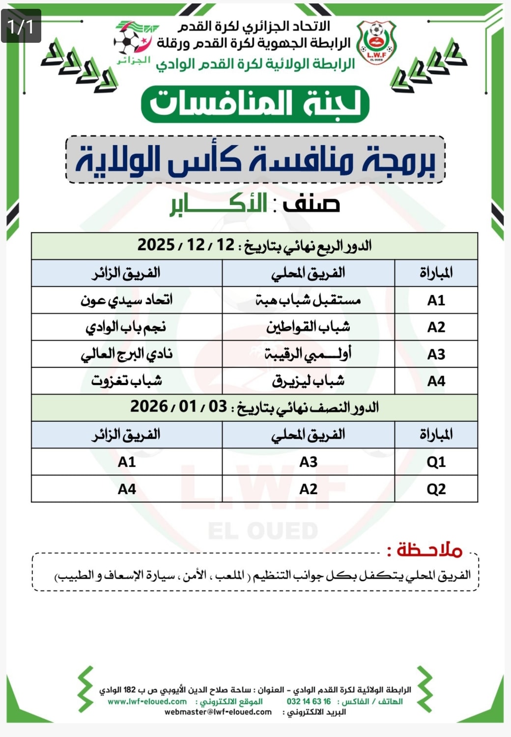 خلال الاجتماع الدوري لمكتب الرابطة اجريت عملية قرعة كأس الولاية (صنف الأكابر) يوم السبت الموافق 2025/10/25 و كانت على النحو التالي