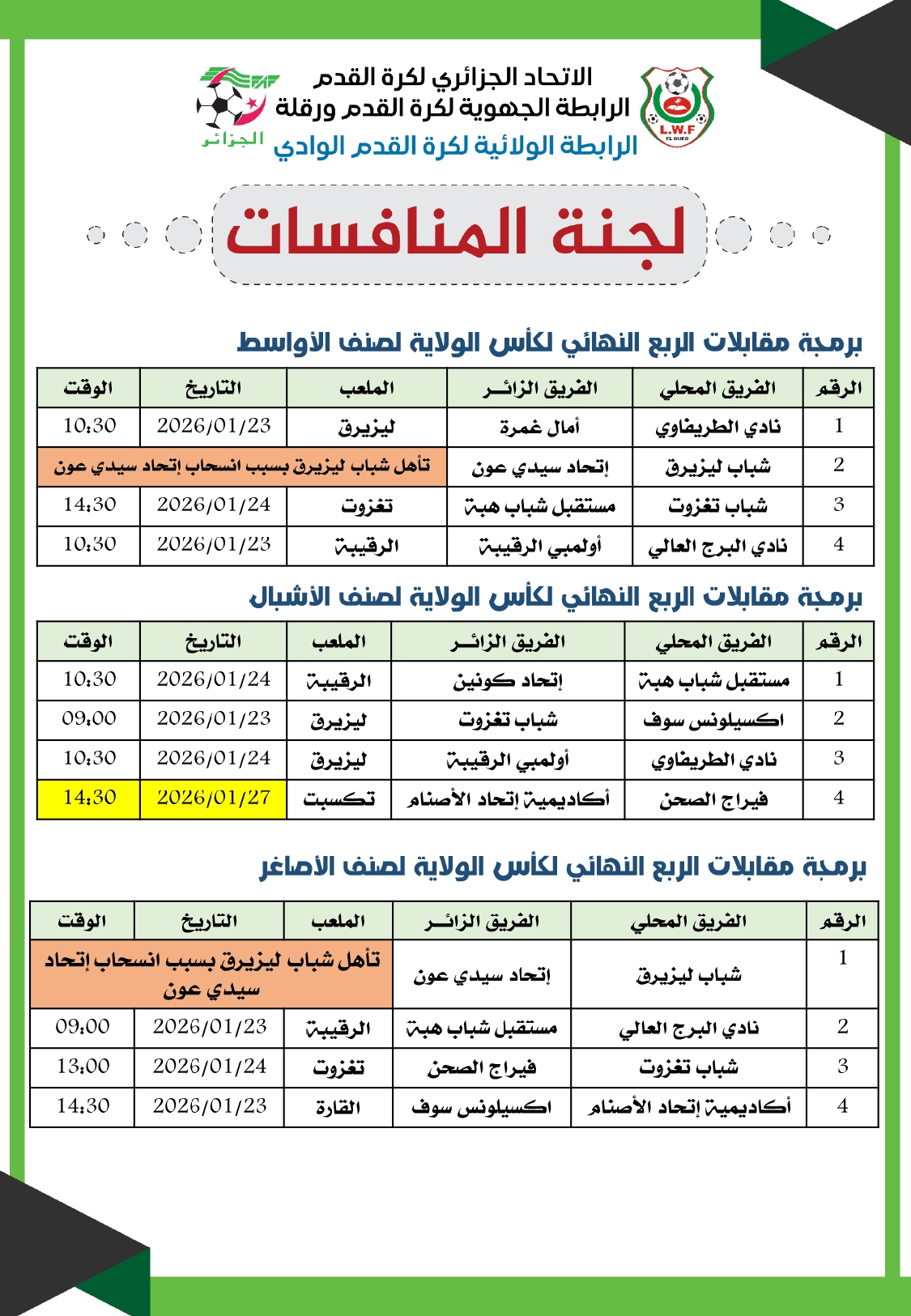 تعلم لجنة المنافسة للرابطة الولائية لكرة القدم عن برمجة الدور الربع نهائي كأس الولاية لفئة الأواسط و الأشبال والأصاغر وذلك يوم الجمعة والسبت 23 و 24 جانفي 2026